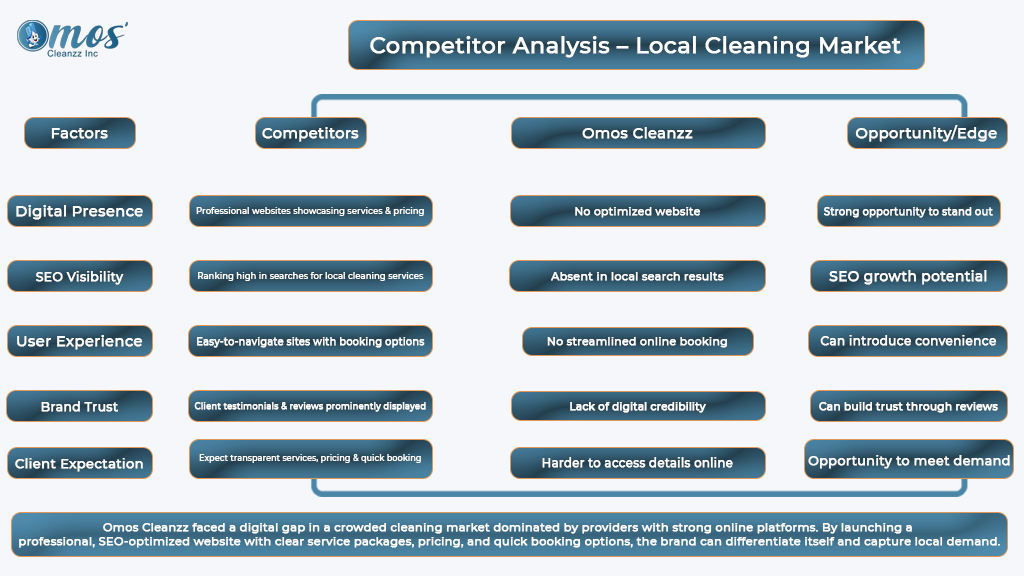 The local cleaning market is competitive, with many providers, from small-scale businesses to large companies, having a digital presence. Our analysis showed that established competitors have professional websites that clearly highlight their service packages, pricing, and client testimonials. This created a significant digital gap for Omos Cleanzz, as its lack of an optimized website made it difficult to compete in the online space.