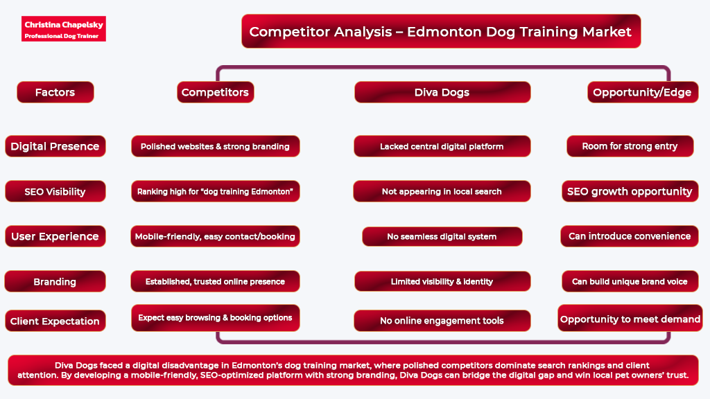 Before this project, Diva Dogs had a non-functional website that made a poor first impression and limited client trust. Potential customers struggled to find reliable information, and the outdated platform prevented the company from showcasing its expertise. As a result, competitors with modern, user-friendly websites were gaining a significant advantage in the Edmonton dog training market.