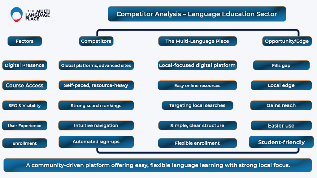 The language education sector is highly competitive with global platforms already offering advanced courses and features. This created a significant digital gap for The Multi-Language Place as local and community-focused providers were not well-represented online. Competitors were dominating local searches, while students now expect easy access to online resources, intuitive course navigation, and the option for self-paced enrollment.
