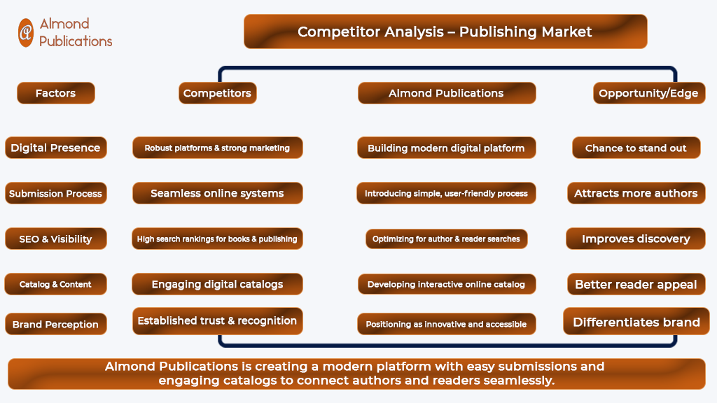 The publishing market is highly competitive, with established players already using robust online platforms for submissions and digital marketing. This created a significant digital gap for Almond Publications, but it also presented a growth opportunity. Competitors were more visible in search results, attracting both authors and readers. To compete, Almond Publications needed to meet the user expectation for a seamless submission process and an engaging digital catalog.