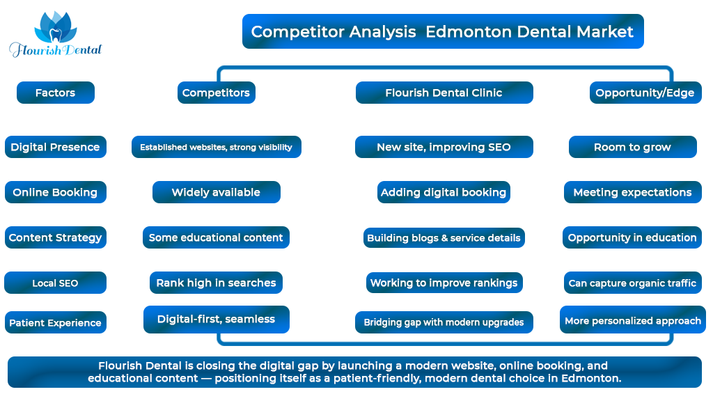 Edmonton’s dental market features established practices with robust websites, online booking, and active digital engagement. Flourish Dental faced a digital gap against competitors ranking high in local searches and capturing organic traffic. Patients expect modern websites with clear service details, digital booking, and educational content.